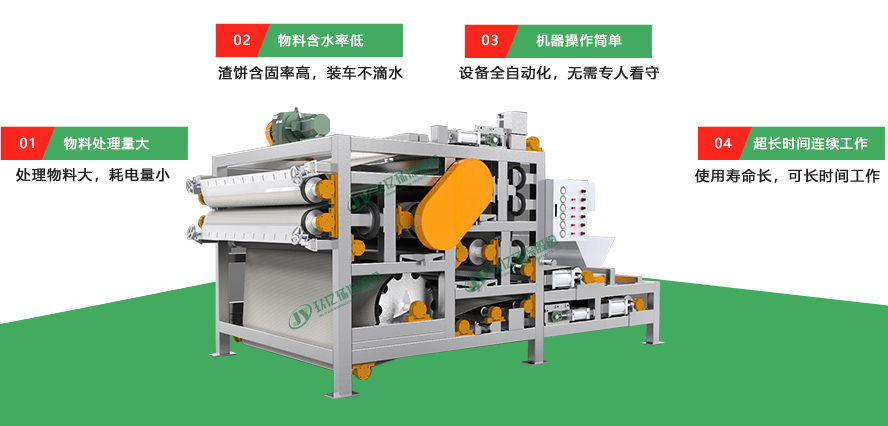3.占地面积小,适用各种植物渣浆纤维物料脱水,效率高,处理量大。设备非常适合在空间有限的环境中使用,并且可以快速高效地处理大量的植物渣浆纤维物料。